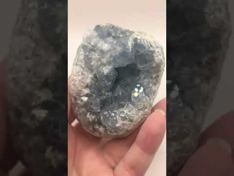 Celestine (also known as celestite) is a blue crystal geode. It's named after the latin name 'caelestis' which means celestial or heavenly. It is quite rare because it's difficult to get out of the ground in one piece. It's a stone that's strongly connected to the spirit realm and the divine. If you are drawn to this stone you may be highly intuitive. It's good for developing psychic abilities and has been linked to astral travel and developing intuition. It has been linked to the crown chakra, third eye chakra and throat chakras. It can also be used for grounding and protection.