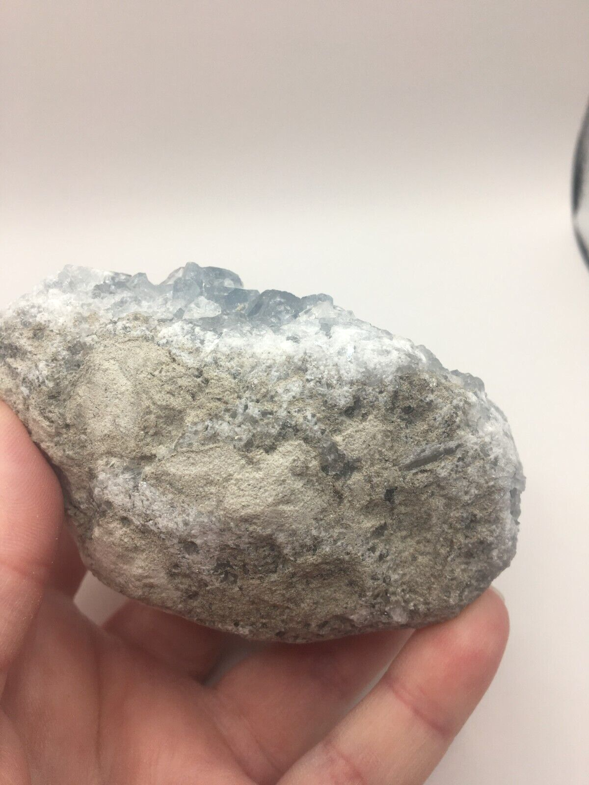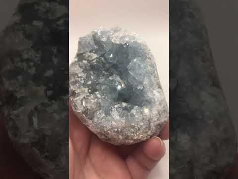 Celestine (also known as celestite) is a blue crystal geode. It's named after the latin name 'caelestis' which means celestial or heavenly. It is quite rare because it's difficult to get out of the ground in one piece. It's a stone that's strongly connected to the spirit realm and the divine. If you are drawn to this stone you may be highly intuitive. It's good for developing psychic abilities and has been linked to astral travel and developing intuition. It has been linked to the crown chakra, third eye chakra and throat chakras. It can also be used for grounding and protection.