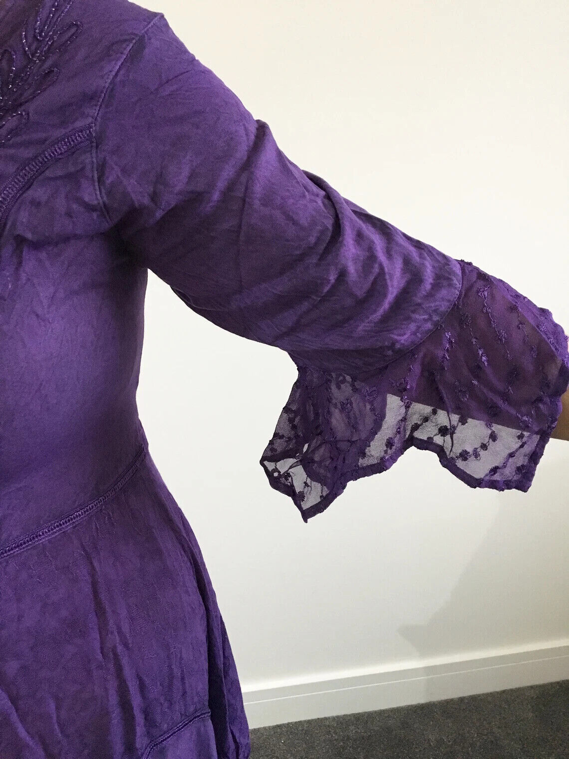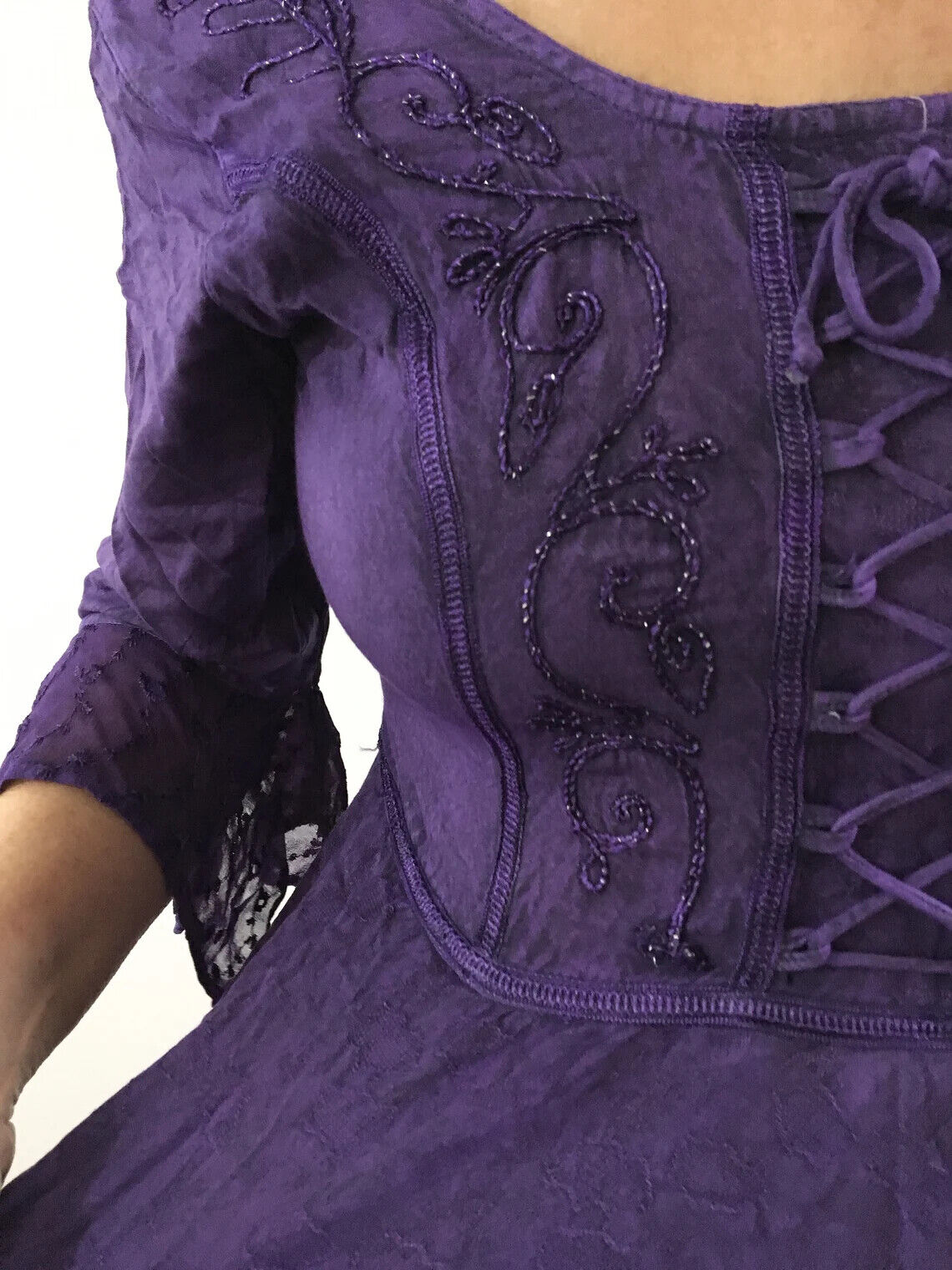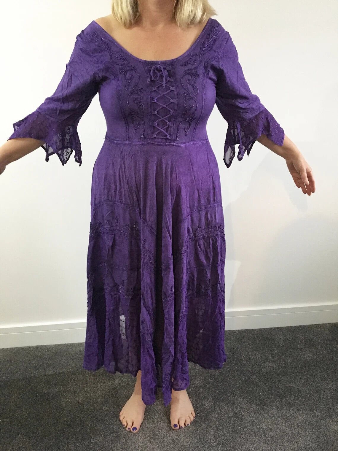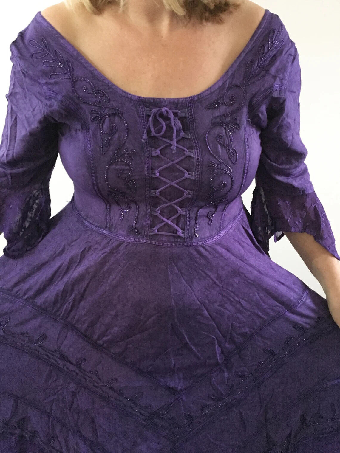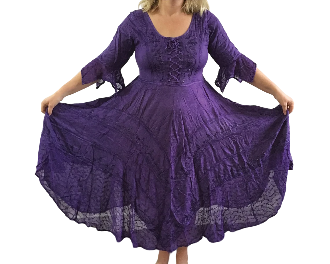 Beautiful witchy medieval style dress with embroidery detail and bell sleeves. Available in Purple, Green, Black, Grey/Silver, Navy Blue and Red.