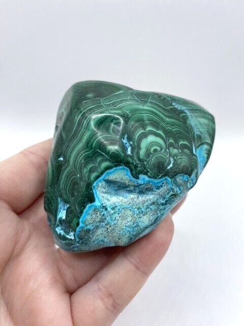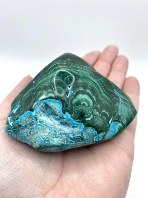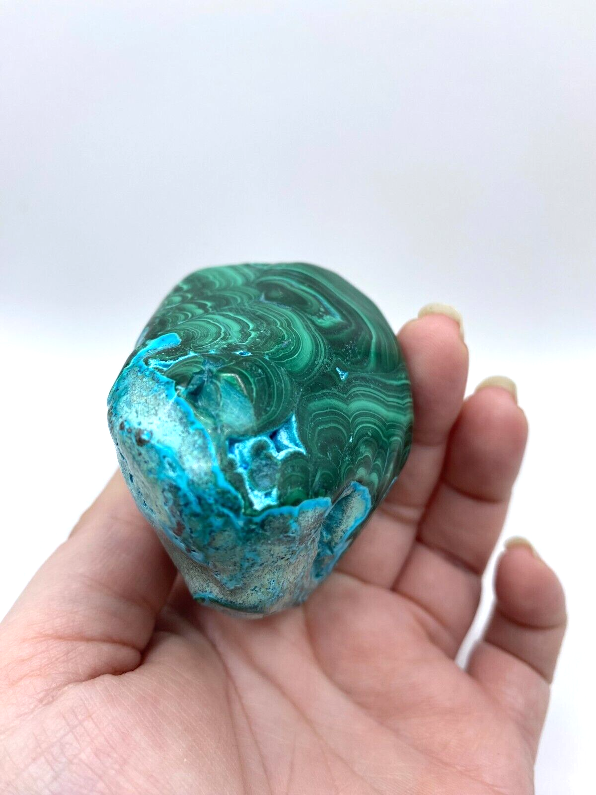 High quality mallacolla crystal Freeform - a naturally occurring combination of both malachite and chrysocolla sourced from the Congo. Each beautiful one-of-a-kind crystal has green malachite and turquoise hues of chrysocolla in stunning patterns. The video shows the exact piece you will receive. 280 g Measures: approx. 10 cm diameter.