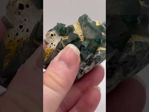 Rare collectable British green fluorite mined from the 50 Year Pocket, Rogerley Mine, Frosterley, Weardale, Co. Durham, England. A beautiful mineral specimen for crystal collectors, the fluorite forms in characteristic cubic structures, each crystal is unique. Fluorite from this mine is highly collectable and said to be some of the finest in the world. The video shows the exact piece you will receive. Weight: 100g; Measures: approx. 8 x 5 cm diameter.