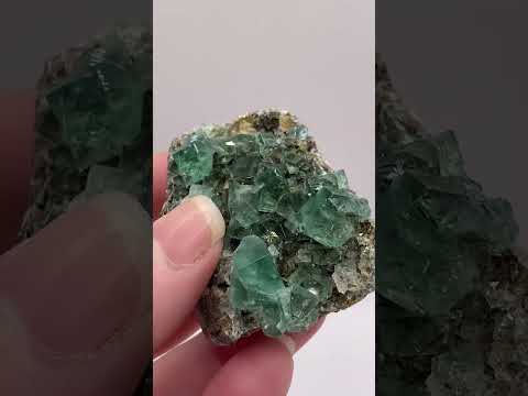 Rare collectable British green fluorite mined from the 50 Year Pocket, Rogerley Mine, Frosterley, Weardale, Co. Durham, England. A beautiful mineral specimen for crystal collectors, the fluorite forms in characteristic cubic structures, each crystal is unique. Fluorite from this mine is highly collectable and said to be some of the finest in the world. The video shows the exact piece you will receive. Weight: 60g; Measures: approx. 4.5 x 3.5 cm diameter.